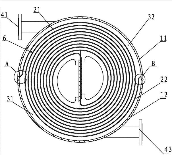目前無論是哪種結(jié)構(gòu)型式,其半圓筒體和螺旋板之間是通過連接板,三者焊接在一起的。如附圖所示的一種螺旋板式換熱器,包括第一殼體11、第二殼體12、第一換熱板21、第二換熱板22、第一連接板和第二連接板,其中,第一連接板的一側(cè)面與第一換熱板21焊接,另一側(cè)面同時與第一殼體11、第二殼體12通過一道焊縫焊接。為了保證第一殼體11、第二殼體12與第一連接板的焊接強(qiáng)度,焊縫需要較大的填充量。第一連接板與第一換熱板21的焊接需要在第一連接板的兩邊焊接。兩張金屬板之間需焊有支撐子,支撐子的排列與固定采用特殊工藝,避免鋼板局部受熱,延遲使用壽命。
