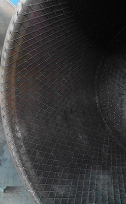 焊接的鋼網(wǎng)龜甲使鋼罐和聚乙烯完美的融合在一起,不脫落。襯塑厚度可達(dá)16mm以上。